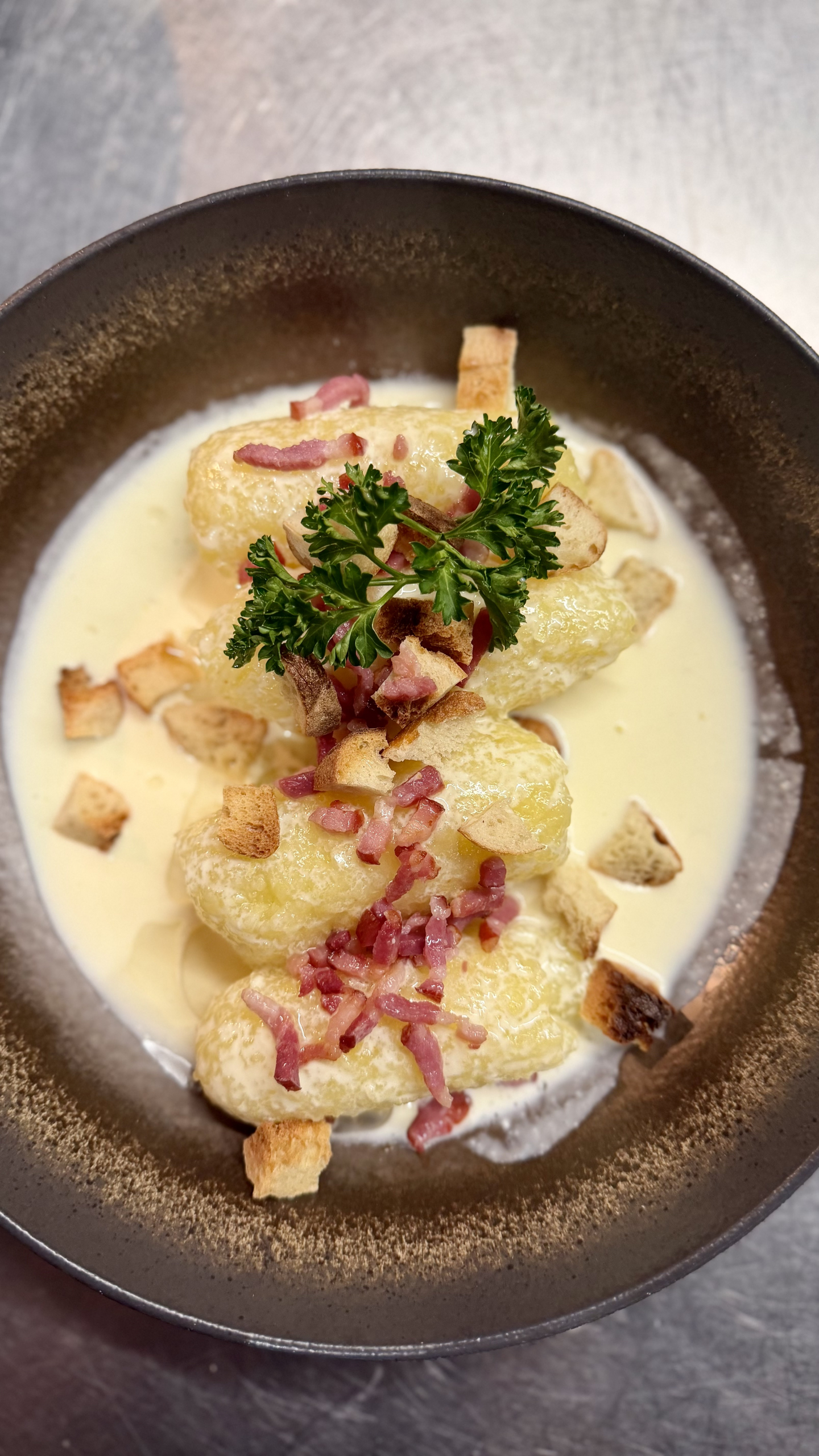 Quenelles de pomme de terre, sauce crème, lardons et croûtons grillés,