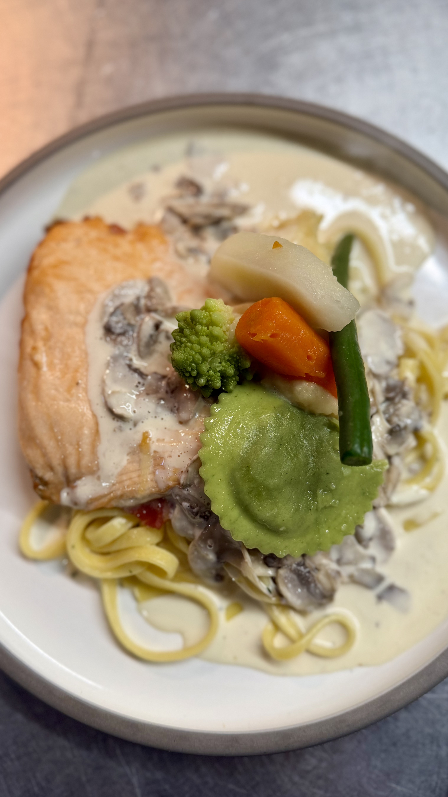 saumon frais garni de jambon et fromage, sauce crème et champignons frais, tagliatelles